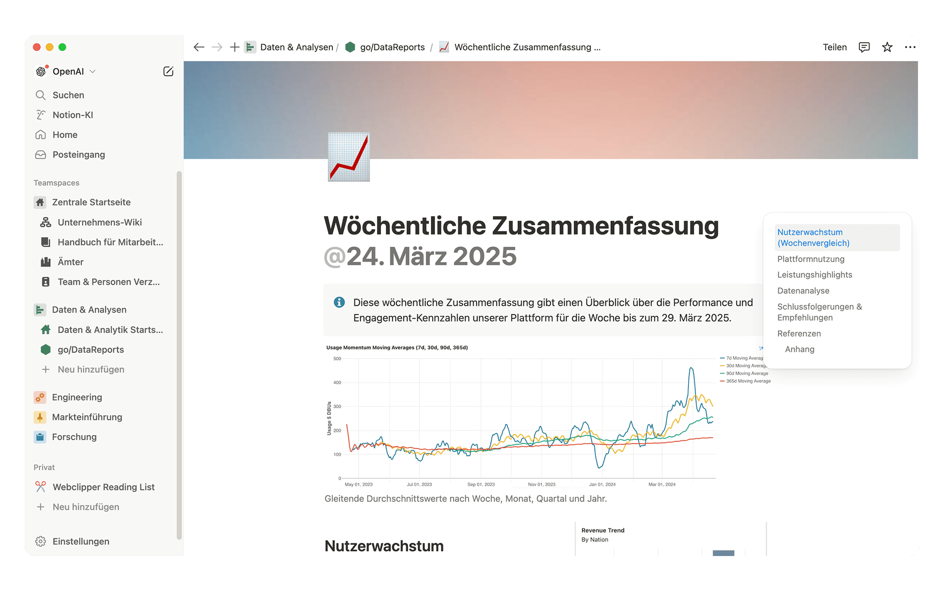 Was OpenAI auszeichnet, ist seine Geschwindigkeit. Mit Notion werden Erkenntnisse erfasst und als Wissen angewendet, das im gesamten Unternehmen umgesetzt werden kann. Der Workspace verbindet nahtlos das Wissen im gesamten Unternehmen und in seinem breiteren Ökosystem von Tools, minimiert Wissenssilos und ermöglicht einen freieren Fluss von Forschungsergebnissen, Datenerkenntnissen, technischen Lösungen und Marktkenntnissen.