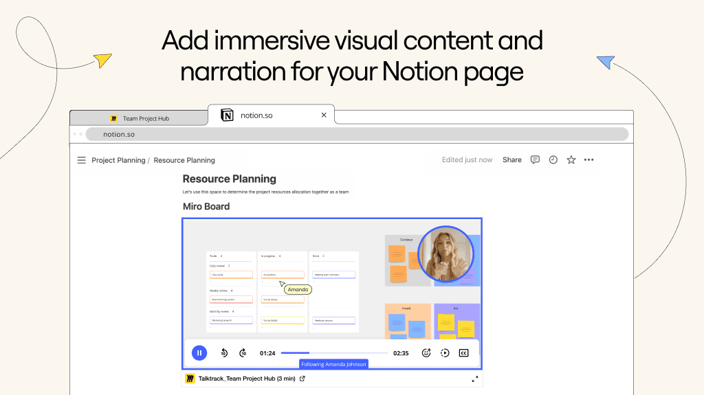 Miro is an online workspace that helps distributed teams of any size to build the next big thing. With Miro embeds, you can easily bring visual context into your Notion pages - including Miro diagrams, journeys and roadmaps. Miro is embedded as a live artifact, with a real-time sync, ensuring that the content is up to date at all times.
